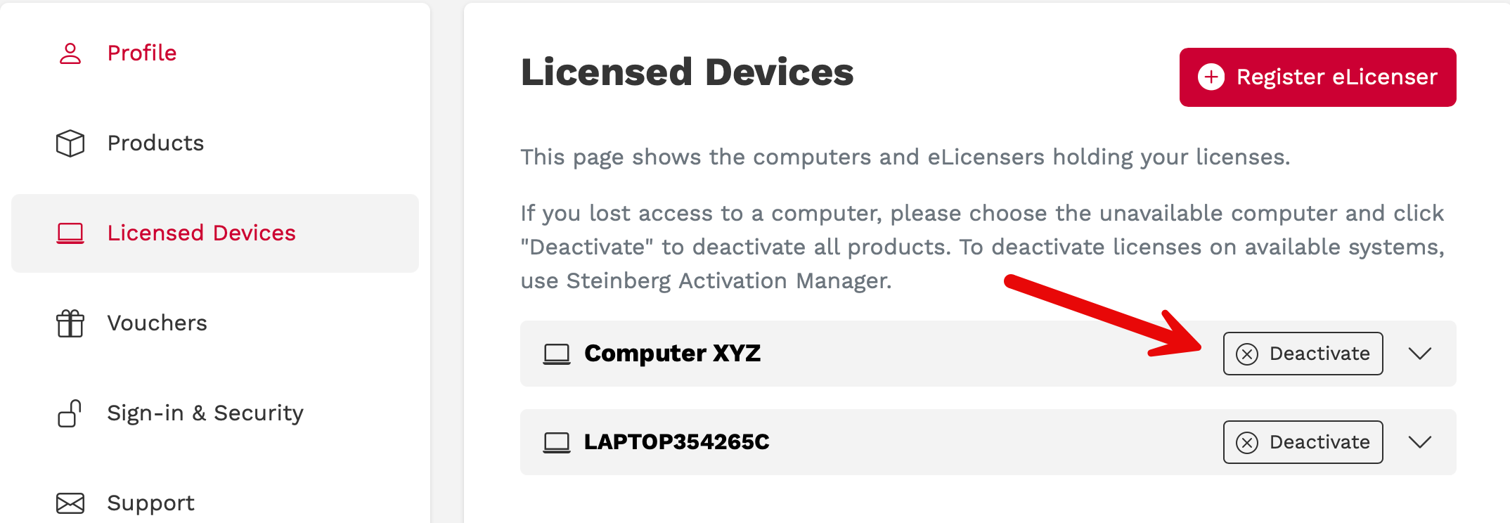In case the system is still accessible, please log in to your MySteinberg account, go to “Licensed Devices”, and click on the “Deactivate” button next to the device you want to deactivate.
