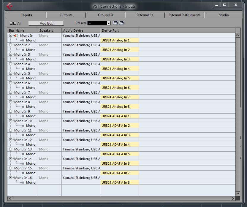 Creare la quantità desiderata di tracce di input e assegnarle come necessario, gli ingressi MR analogici saranno disponibili come dispositivo master ADAT Inow you need to create the proper VST Connections (F4 or Devices -> VST Connections) in Cubase.