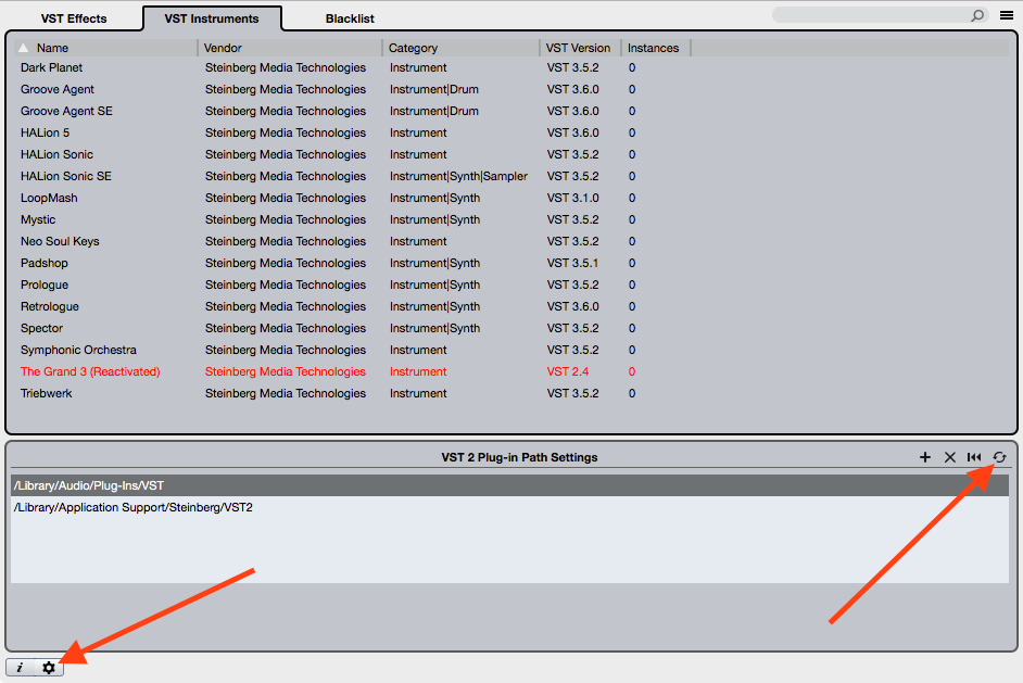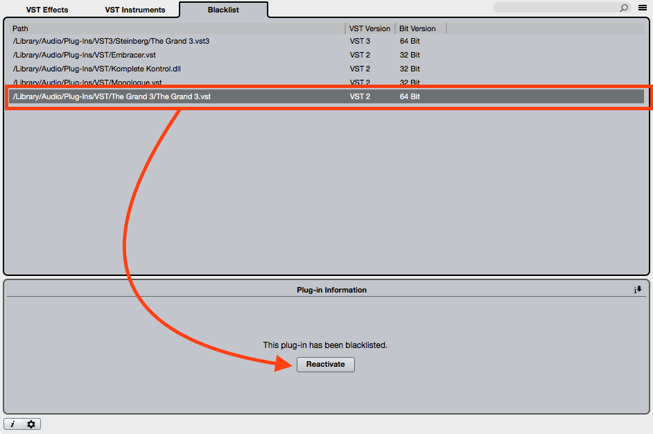 Si noti che tutti i plug in a 32- bit vengono automaticamente disabilitati messi nella “Blacklist”, in quanto Cubase 9 supporta solo i plug-in a 64-bit.